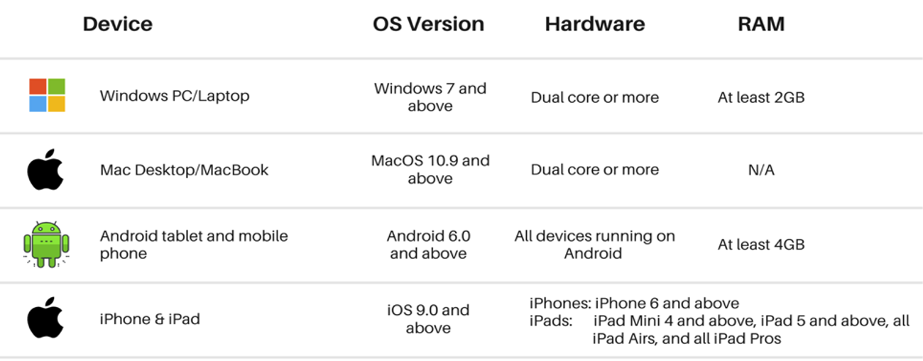 You need access to a laptop, desktop computer, or smartphone with a reliable internet connection to complete the work assigned in the online subjects or sections.As a general reference, a table is provided below to identify preferred minimum requirements for devices to support online classes